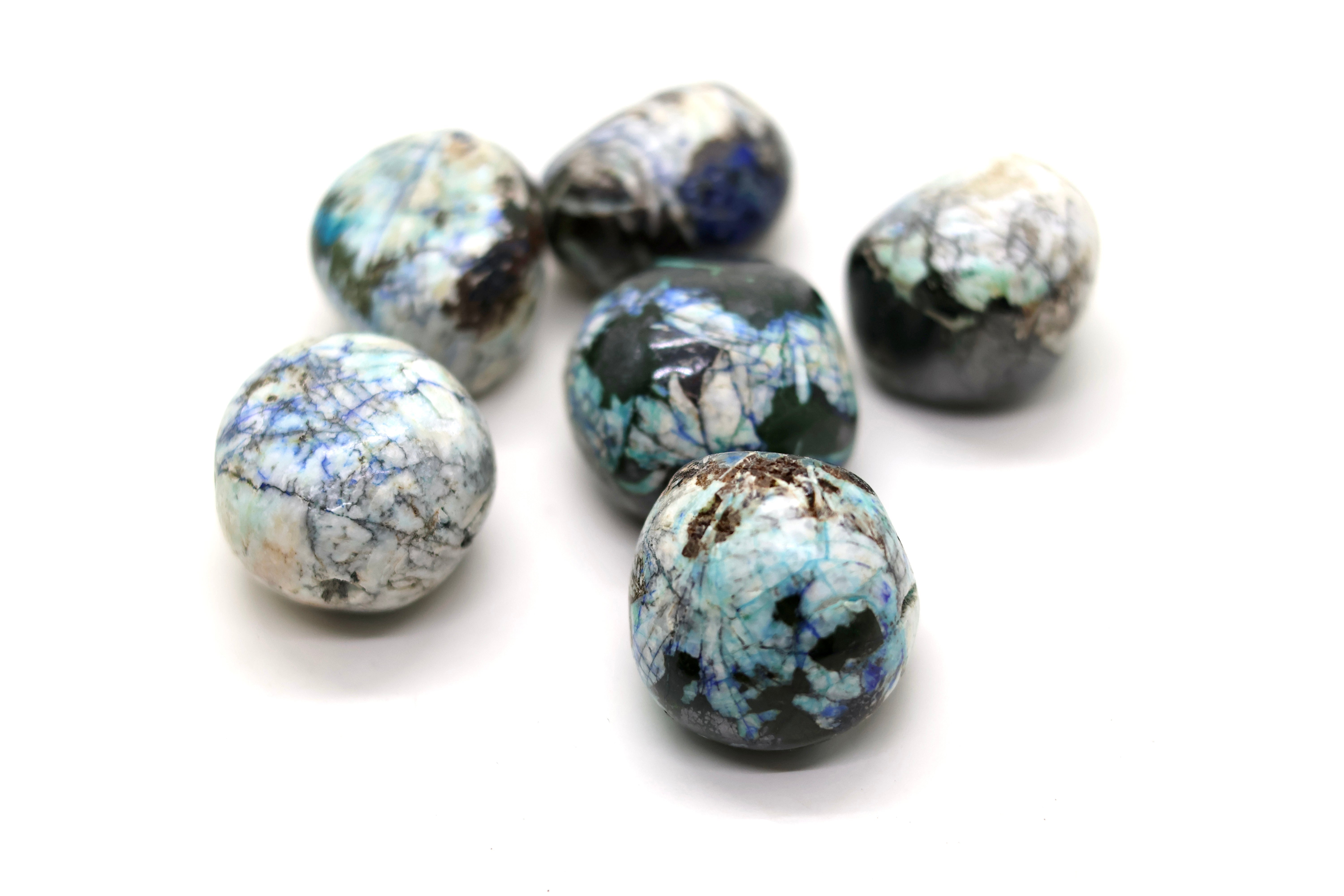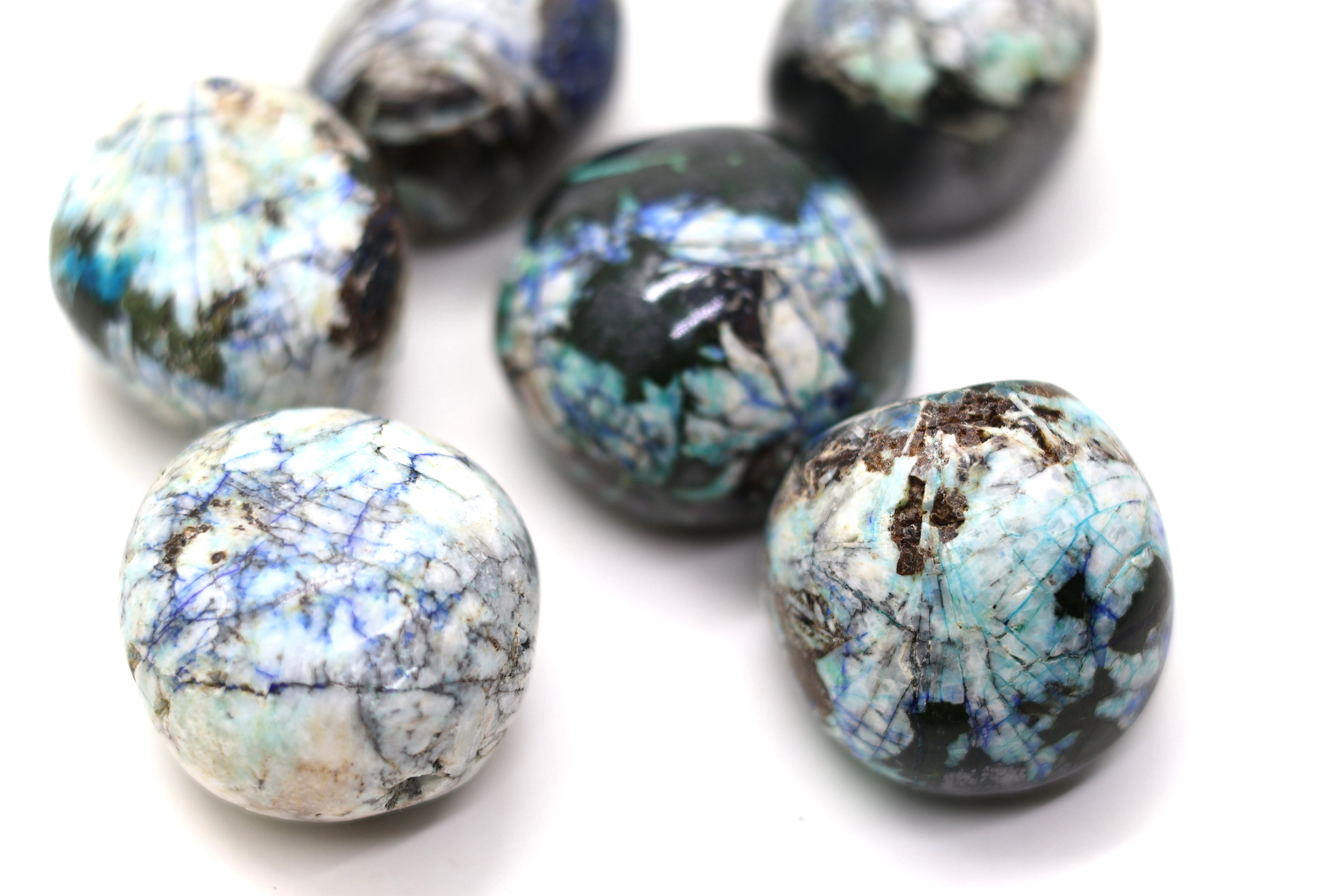 These large tumbled stones incorporate both properties of Azurite & Malachite. Malachite, specifically, is the stone of “transformation.” Clears and activates all chakras. Aids in clarifying the emotions and releasing negative experiences. Stimulates intuition. It is extremely protective. Helps one look deep within to see who one really is. Azurite is called the “Stone of Heaven” because it promotes one’s pursuit of the “heavenly” or authentic self. Good for psychic development and an understanding of what is learned psychically. Enhances creativity, and eliminates worry and indecision.