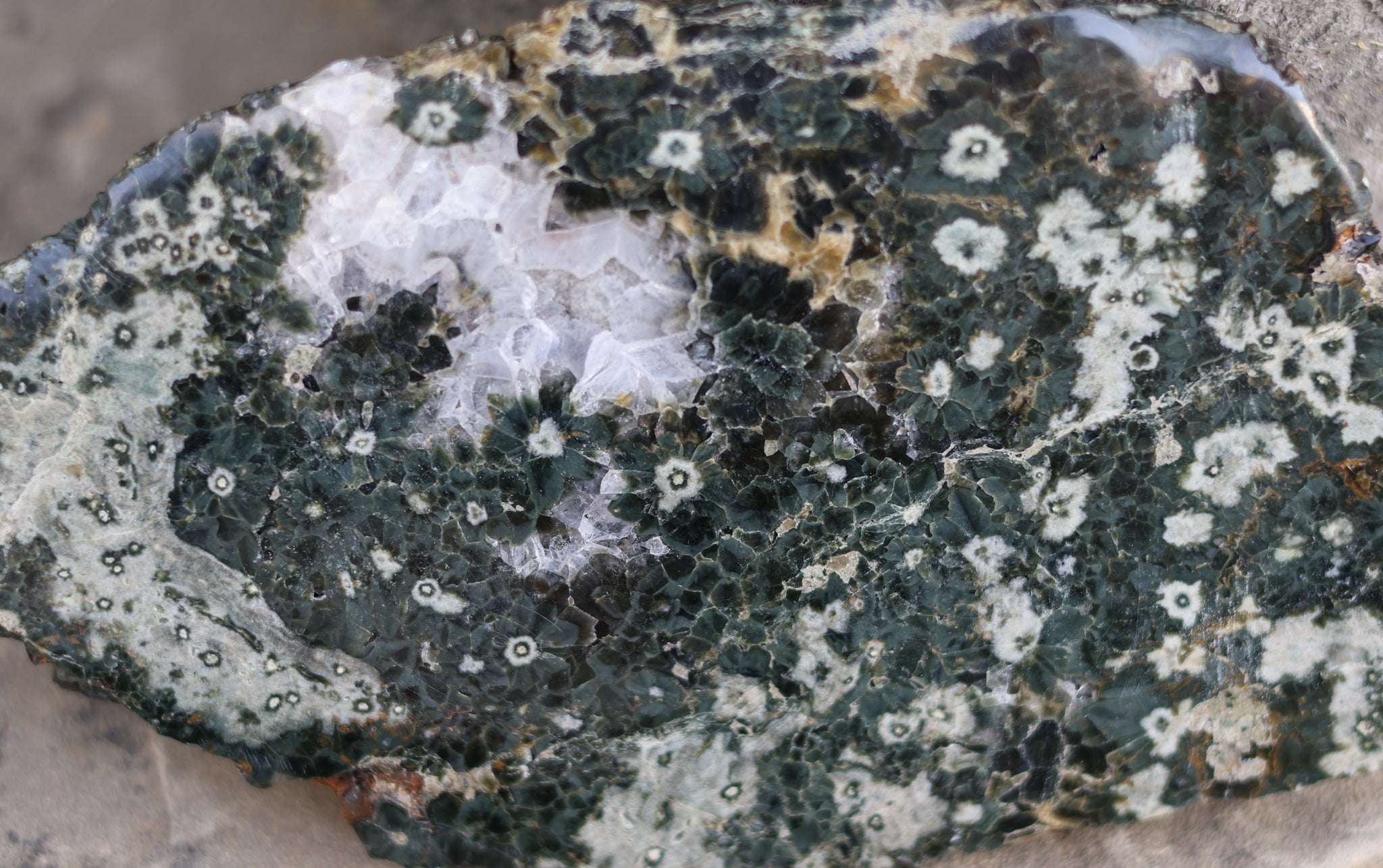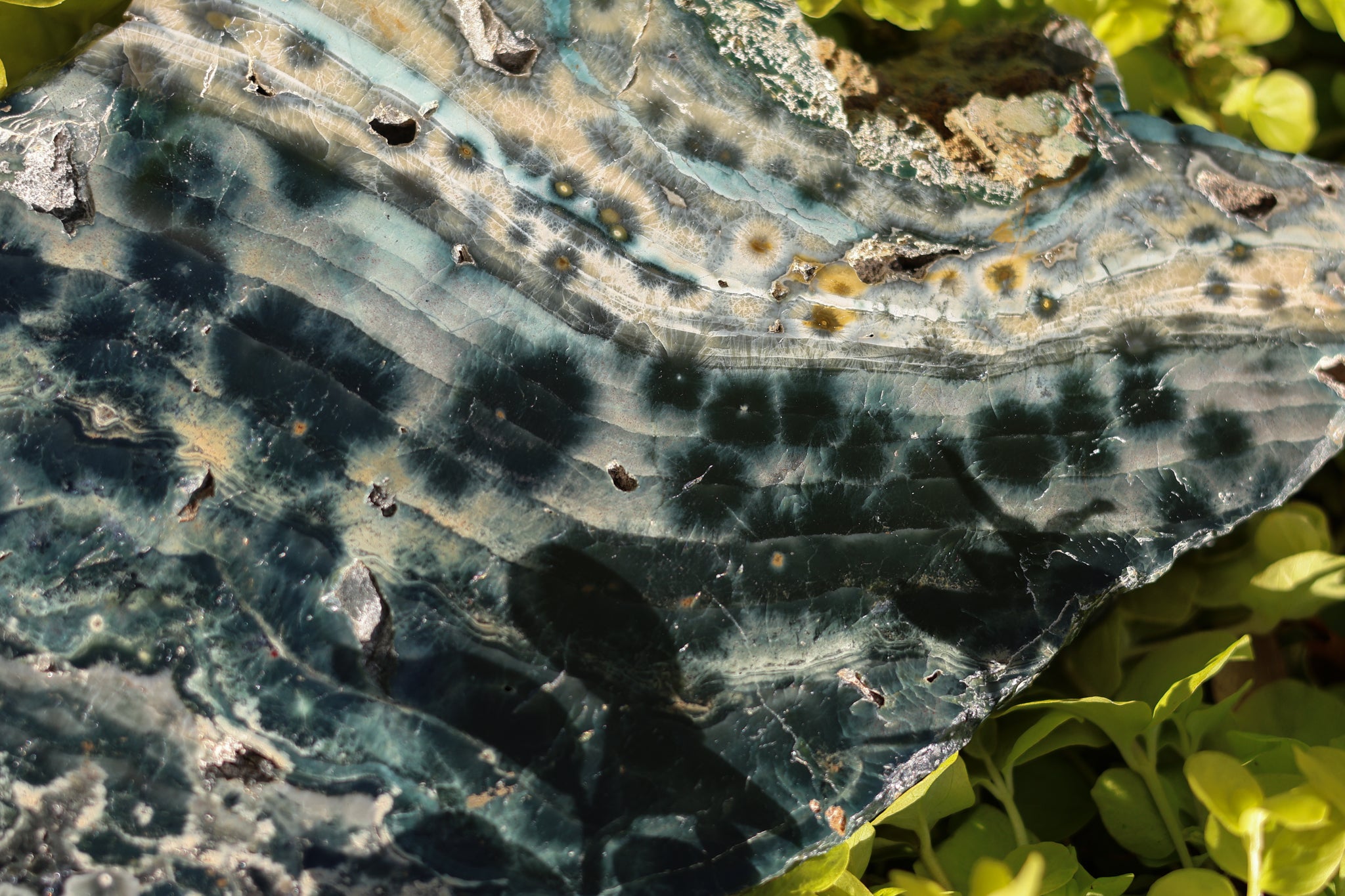Ocean Jasper is also referred to as Ocean Spray Agate or Orbicular Jasper, named for its barnacle-like pattern or "orb"-like appearance. It brings joy and high spirits into ones life & helps to align the solar plexus, heart, & throat chakras. It's a stone that helps promote emotional stability & gratitude, & helps us stay grounded in the here and now. It also helps one to feel, speak and act more positively & assists in living a positive, happy life while moving freely with the natural ebbs & flows of life.