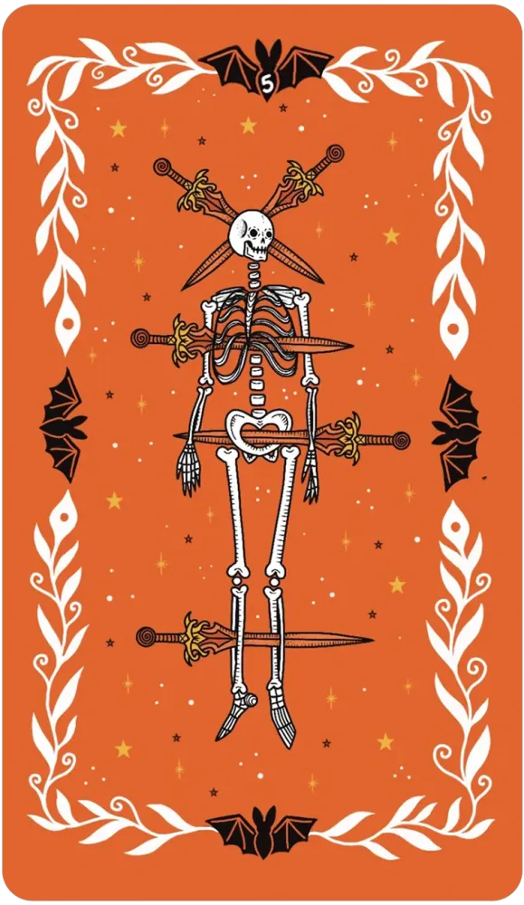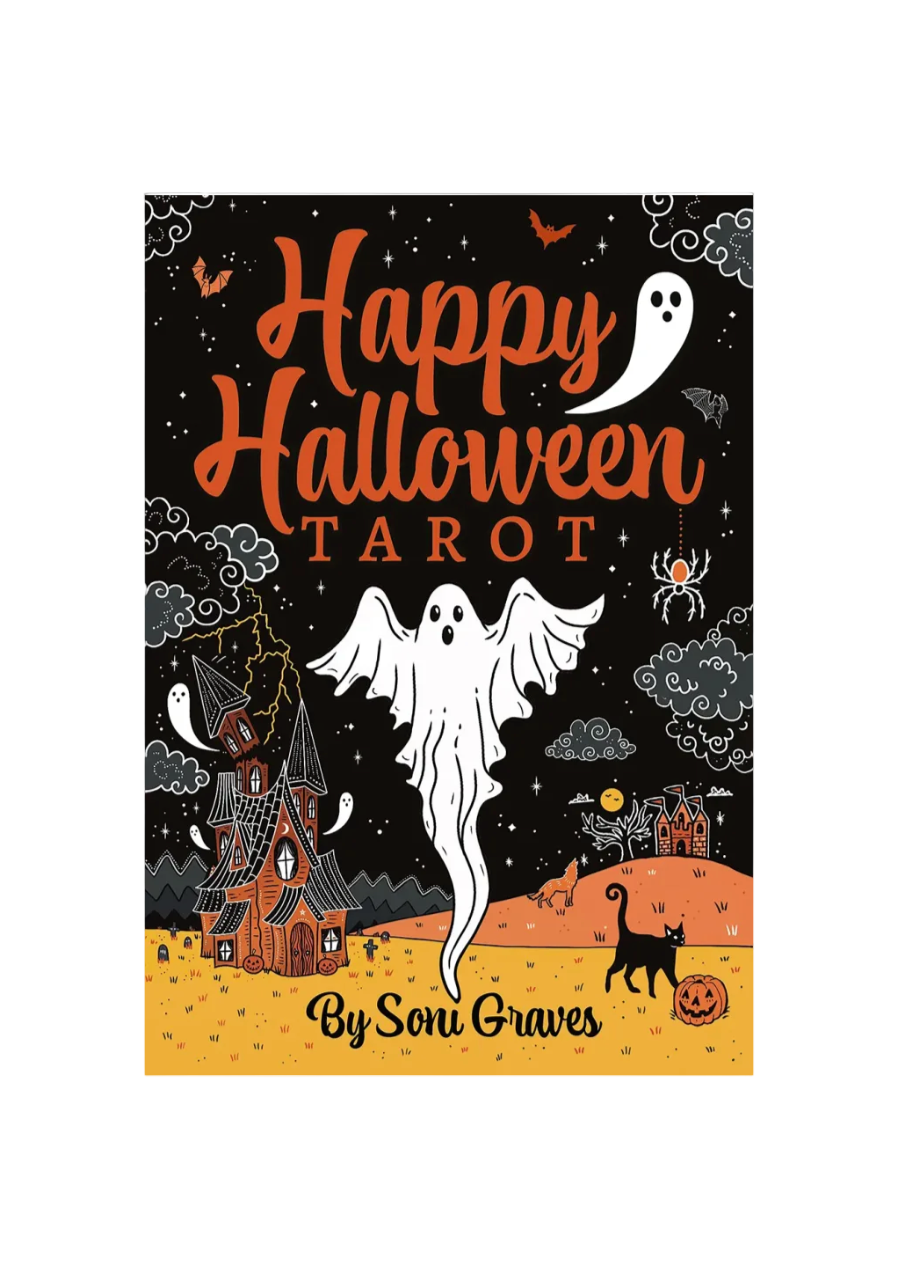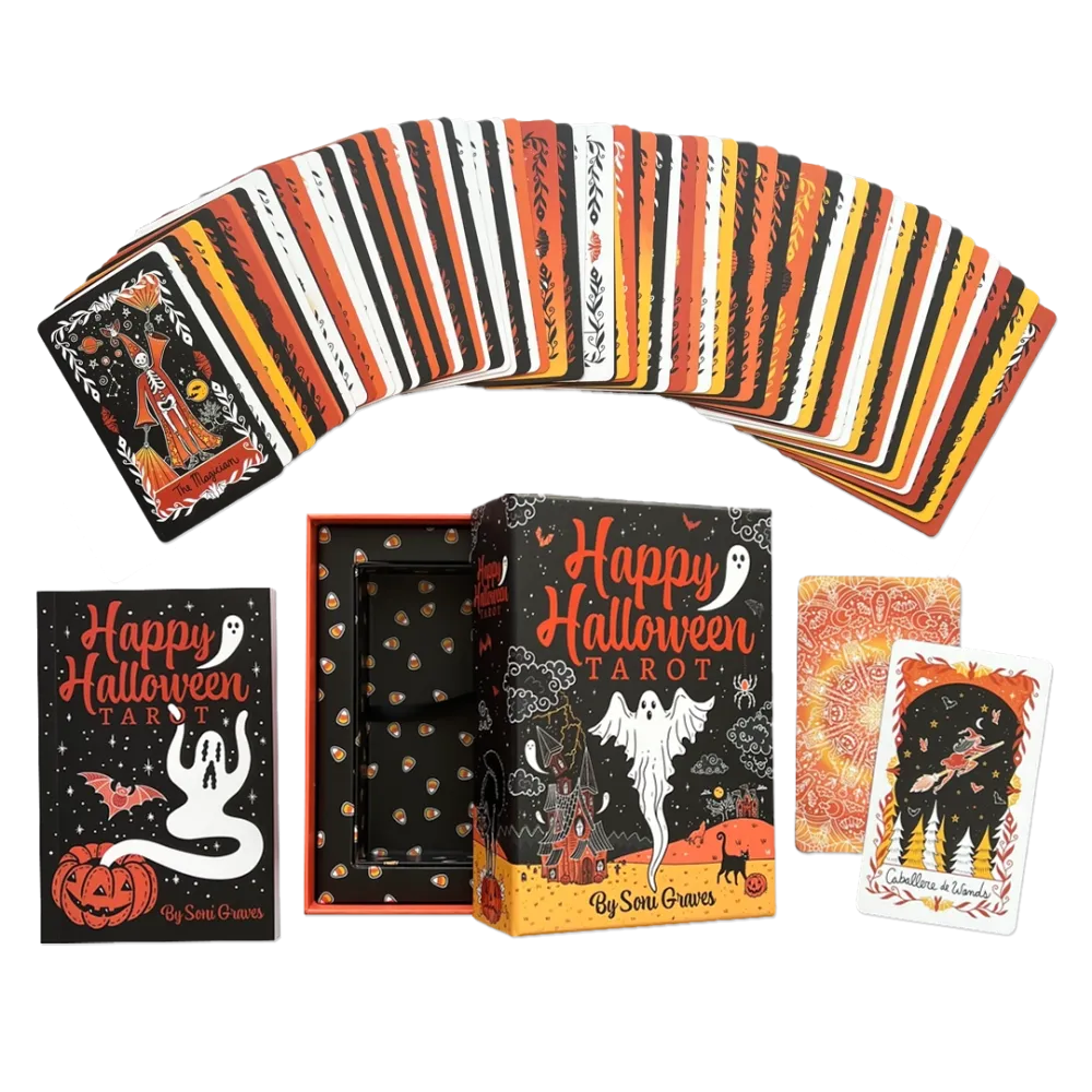 The delightful Happy Halloween Tarot is sure to lift your spirits! Soni Graves found inspiration in iconic vintage Halloween art as well as her own childhood Halloween memories and the joy they brought her. She used a festive candy corn color palette and included her favorite spooky creatures including skeletons, witches, pumpkins and bats. As an homage to her Latin heritage, she chose to use Spanglish titles and gender-neutral descriptions for the Court Cards.