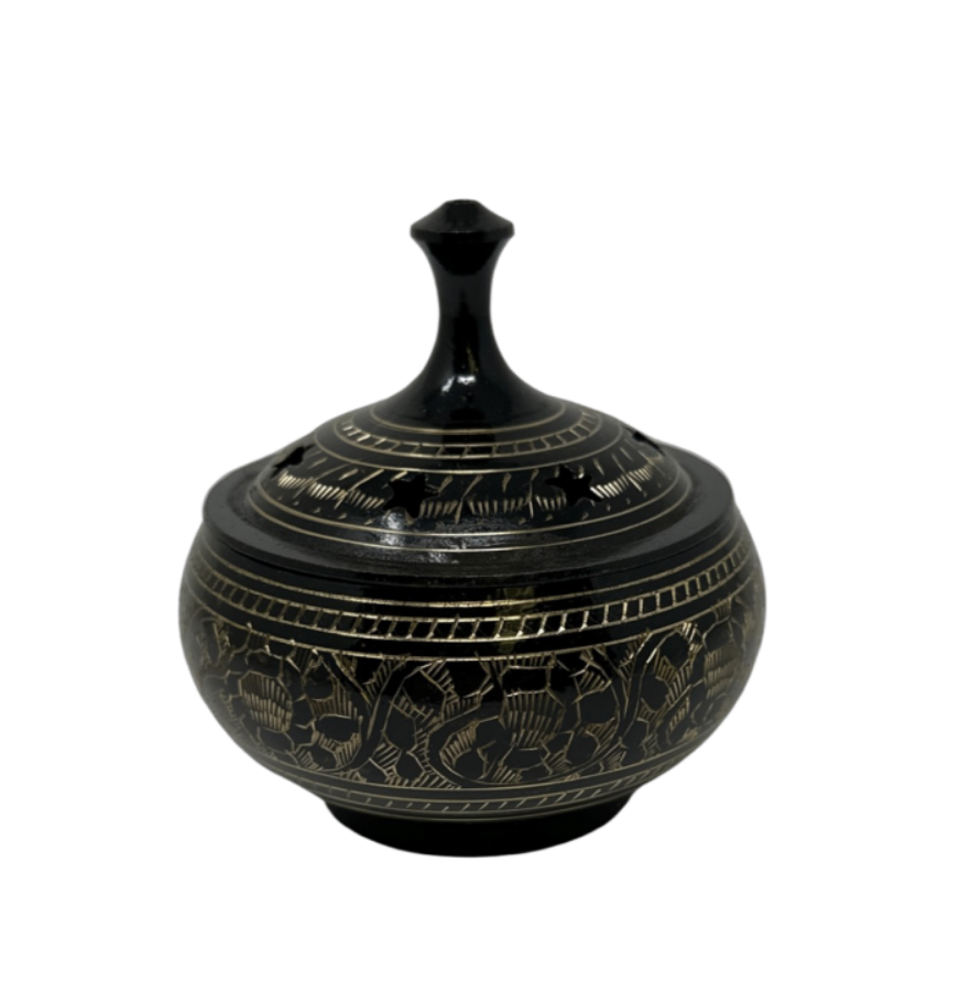 This Black Brass Incense Burner features intricate etched detailing and a lidded design with ventilation cutouts, allowing incense smoke to gently flow while safely containing heat. Measuring approximately 3 inches, it is ideal for burning charcoal, resins, herbs, and loose incense.