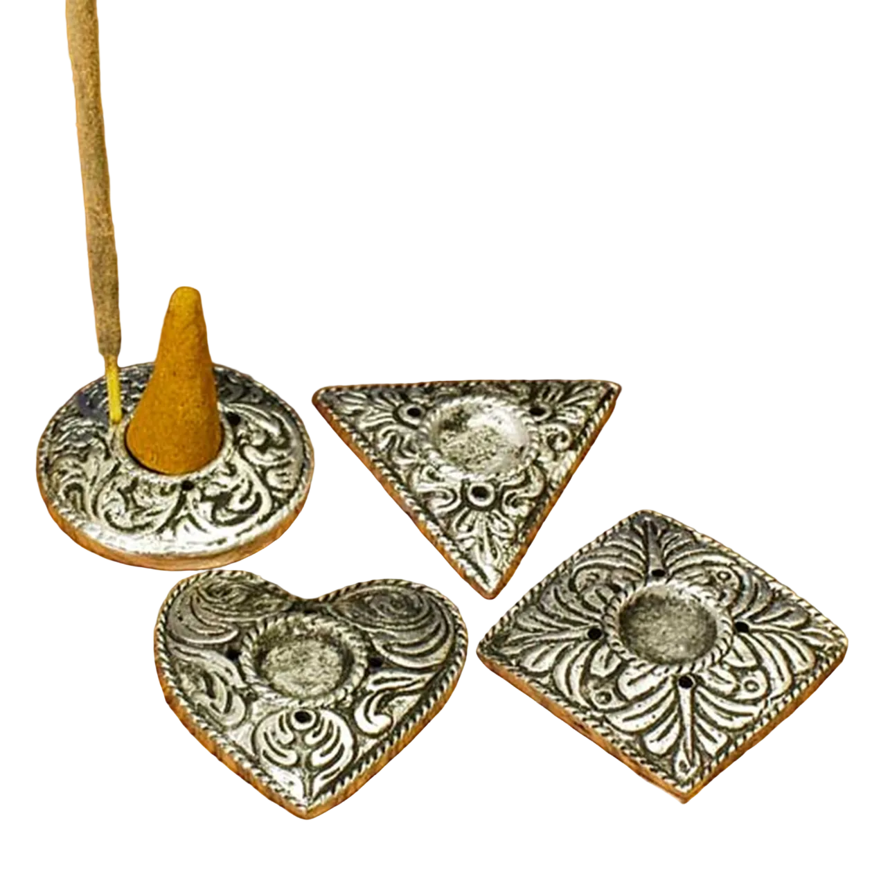 This small antique-style incense burner features delicately etched sacred shapes—star, circle, heart, diamond, and triangle—each symbolizing balance, protection, and intention. Designed to hold both incense sticks and cones, it’s perfect for daily rituals, meditation, or altar use. Its compact size makes it easy to place anywhere while adding a subtle, timeless charm to your space.