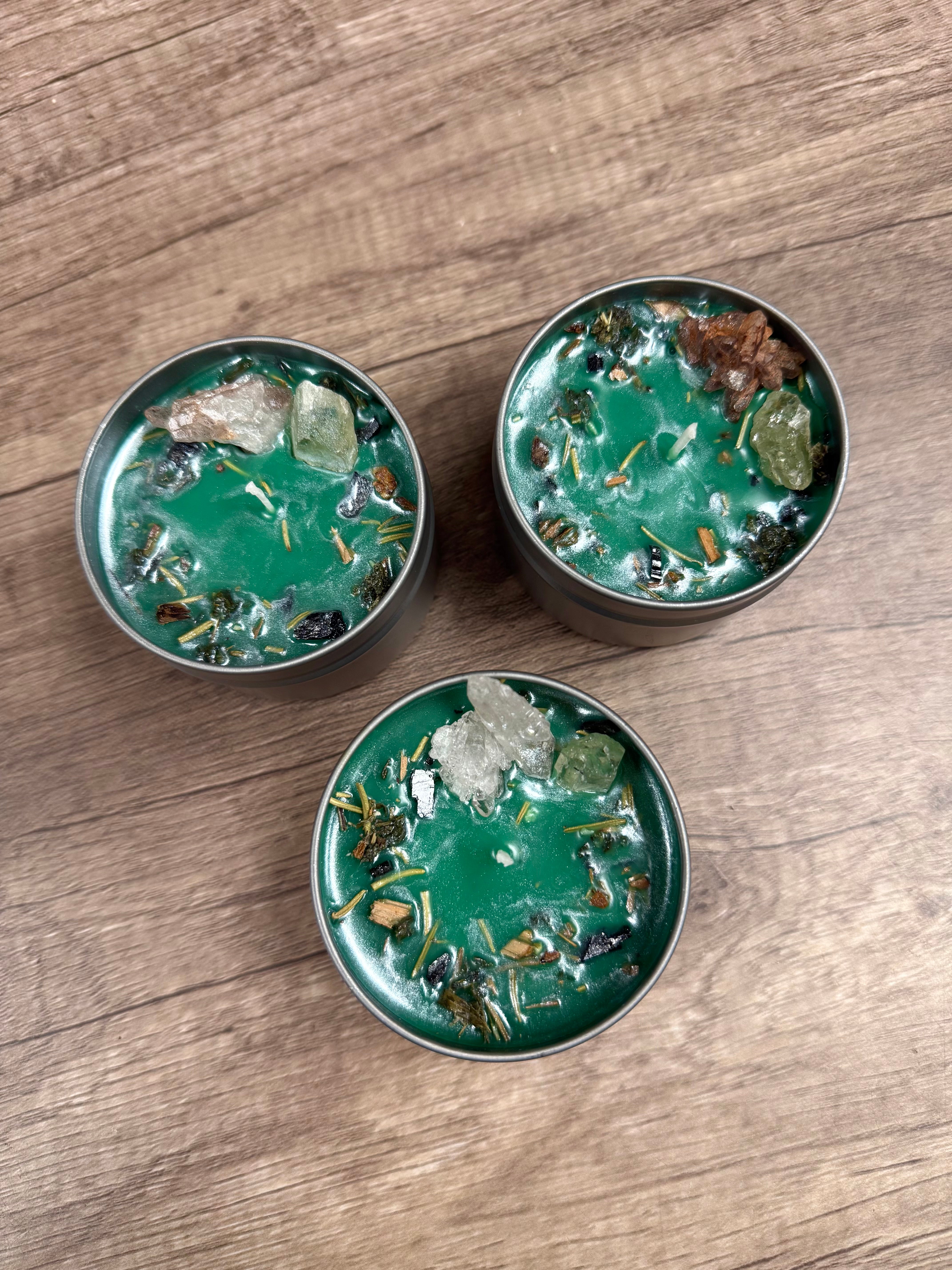 Small 4 oz hand-poured soy wax candle, organic herbs and natural crystals.