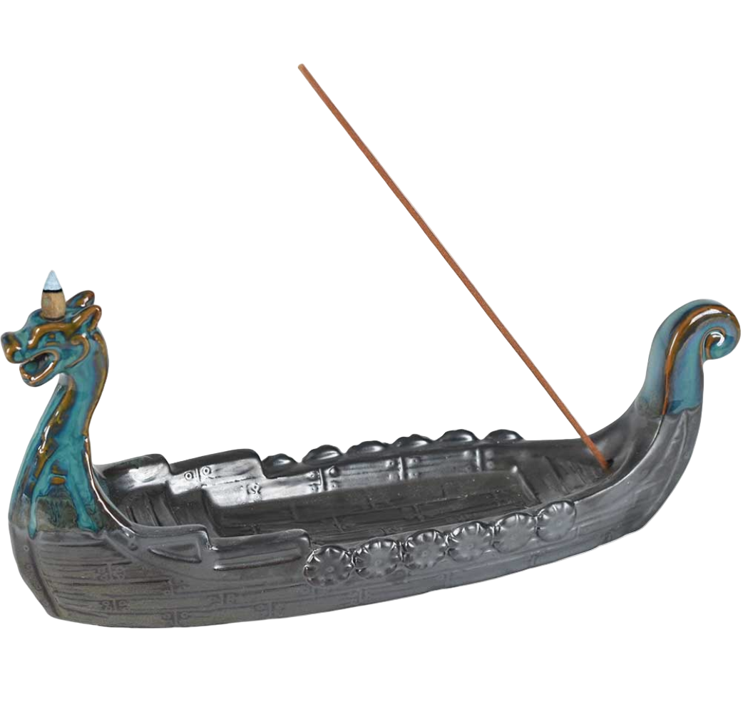 Set sail on a mystical journey with this Ceramic Viking Ship Backflow Burner. Featuring a dragon-headed ship sailing toward Valhalla, this detailed piece captures the strength and spirit of the Norse. When lit, backflow incense cones release cascading smoke that drifts through the ship like mist on the sea. It can also be used with stick incense, making it both versatile and captivating.